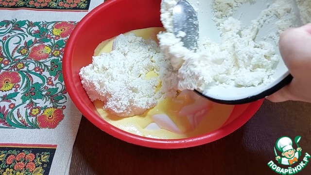 Затем смешиваем белковую и желтковую массу и добавляем 800 г творога. Предварительно я пробила творог блендером, чтобы в процессе приготовления начинка получилась более нежной. Всё хорошенько перемешиваем, отставляем в сторону и займёмся бисквитом.