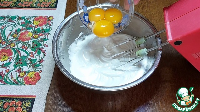 Во взбитые белки по одному вмешиваем желтки. Туда же отправляем 10 г растительного масла.