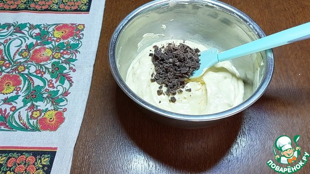 Я заранее измельчила ножом 50 г шоколада (содержание какао 56%). Эту шоколадную крошку добавляем сюда же в тесто и аккуратно перемешиваем.