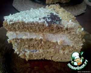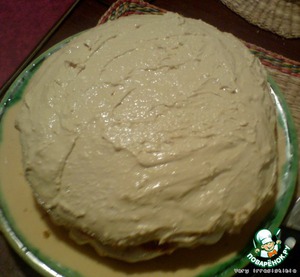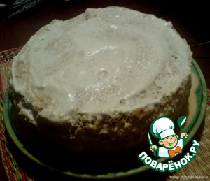 Сверху кладем третий корж, бока на уровне творожной массы заделываем кусочками оставшейся половинки коржа (но оставляем еще для обсыпки боков торта). Обмазываем торт сметанным кремом.