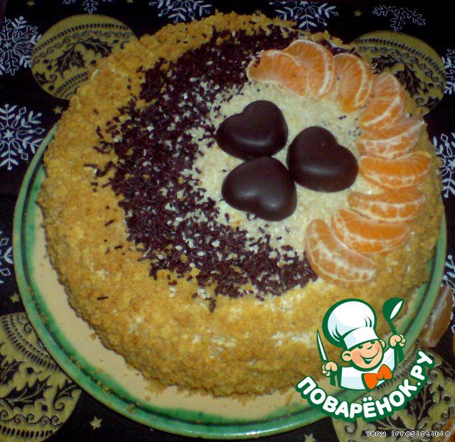Оставшийся кусок бисквита измельчаем в крошку и обсыпаем бока торта, верх украшаем по желанию. Убираем в холодильник на ночь.