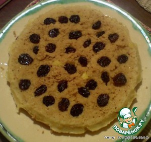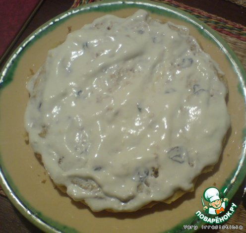 Каждый корж разрезаем на два. Начинаем собирать торт. Нижний корж пропитываем апельсиновым соком и втыкаем в него изюм.