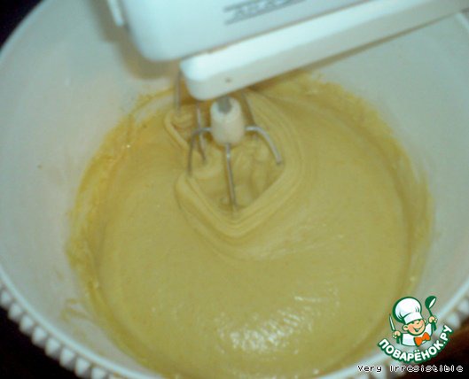 Делаем два таких коржа. Пока коржи пекутся, делаем сметанный крем (взбиваем сметану с сахаром и ванилином) и отдельно растираем творог со сгущенкой (при помощи блендера).