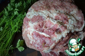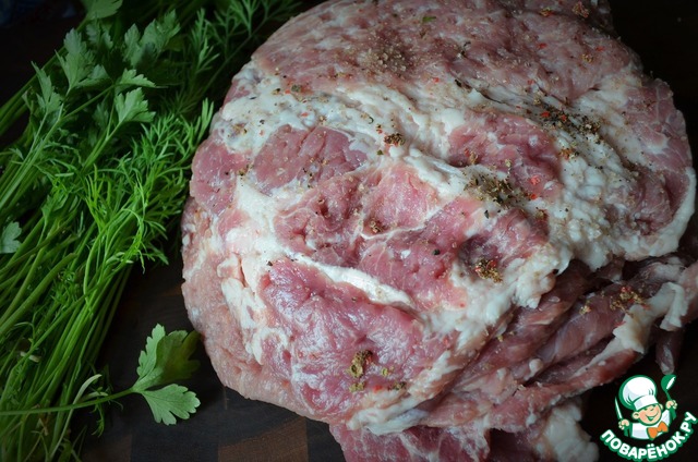 Нарезать свиную шейку на стейки, 6 шт.. Зелень вымыть и обсушить, смесь перцев истолочь.