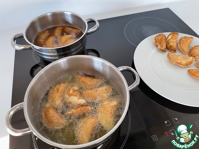 Теперь на каждую заготовку кладем начинку и соединяем края как у вареников. Начинки уходит примерно 0,5 чайной ложки.