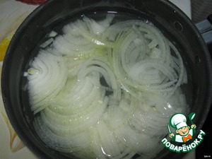 Лук порезать полукольцами и дать настояться в кипятке минут пять.