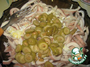 Делюсь с Вами одним из любимых салатов-кальмаровым. Этот рецепт возможно кому-то знаком, я в него добавляю еще и оливки. Салат очень вкусный, немного острый.