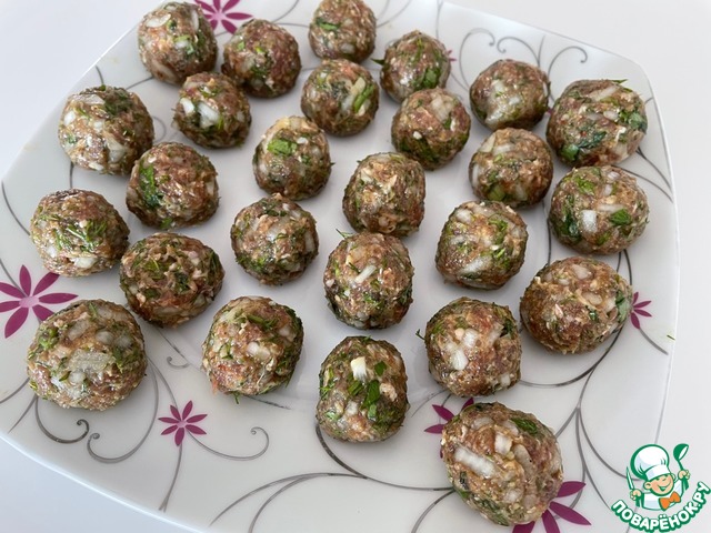 Для фрикаделек измельчаем лук, чеснок и зелень. Из всех ингредиентов вымешиваем фарш, добавляем любимые специи и солим по вкусу. Лепим фрикадельки размером с перепелиное яйцо. Отправляем их в холодильник на 30 минут.