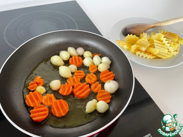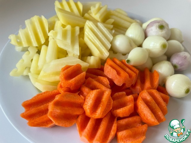 Чистим и нарезаем овощи. Очень красиво в блюде смотрится лук-арпачик, если его нет, нарезаем крупными кусками репчатый лук.