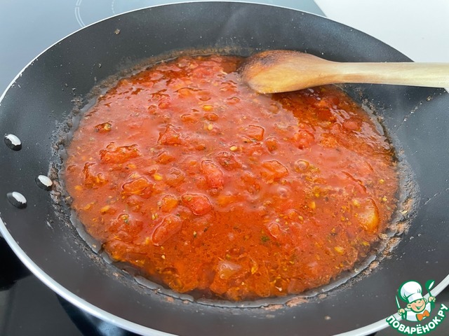 Готовим соус. Чистим помидоры от кожицы и нарезаем мелкими кубиками, слегка протушиваем на масле, добавляем для интенсивного цвета томатную пасту, специи и соль. В зависимости от того, любите ли вы много подливы в блюде, добавьте воды. У меня обычно уходит 100 мл. Все вместе поварим 5 минут