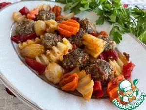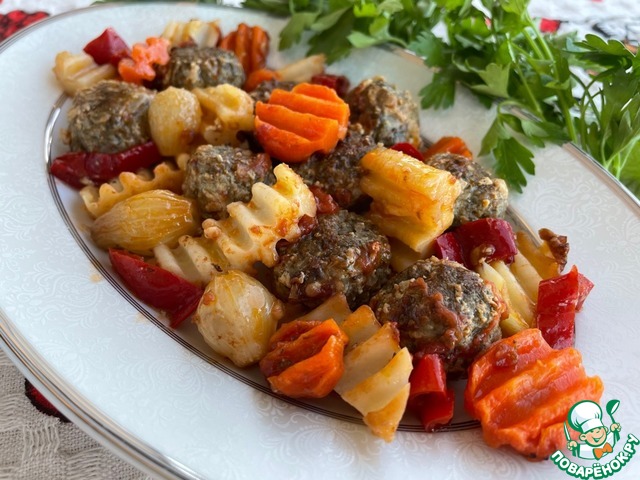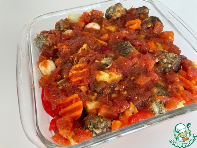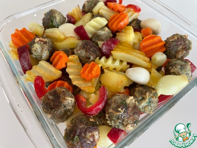 Обжаренные овощи и фрикадельки, порезанный болгарский перец произвольно складываем в форму для запекания. Если любите запеченный чеснок, кладите почищенные зубчики целиком.