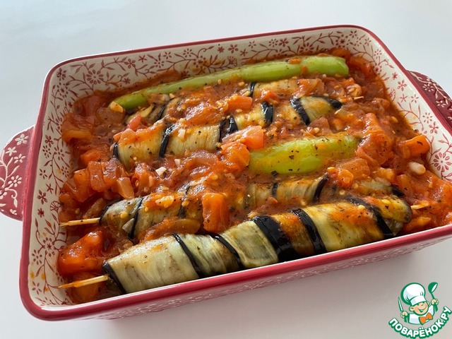 Оборачиваем наши заготовки из фарша на шпажках в баклажаны. Если пластины баклажанов широкие, можно разрезать на две полосы.