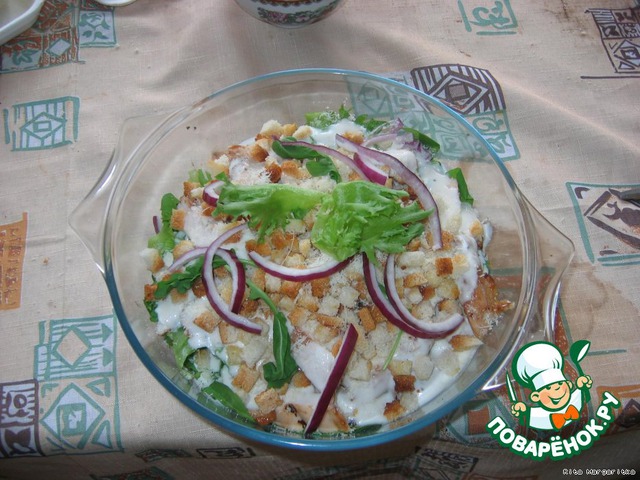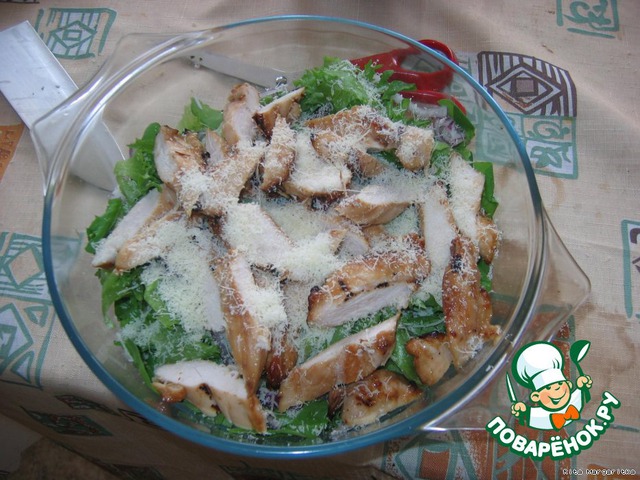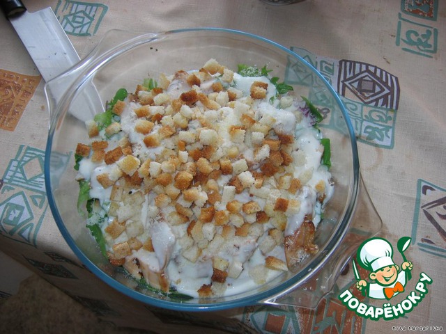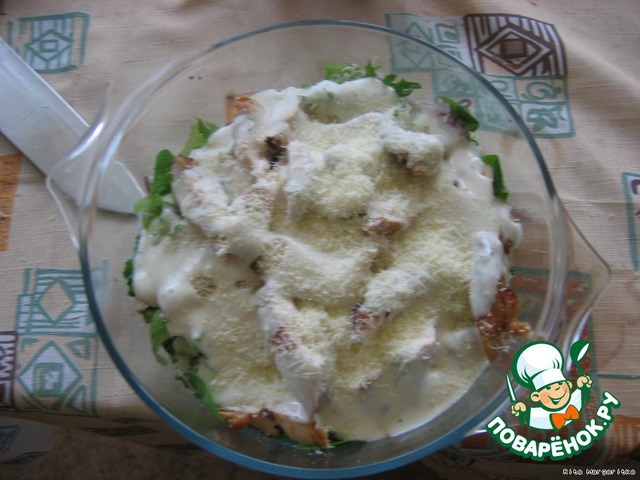Поливаем соусом "Цезарь" и снова посыпаем сыром