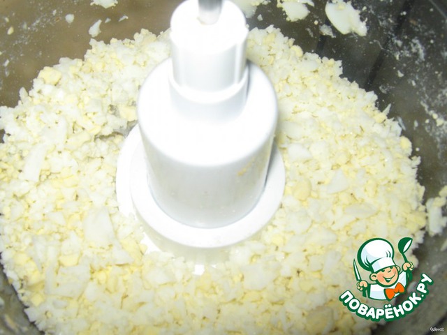 Яйца трем на терке или пропускаем в комбайне.