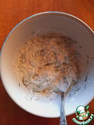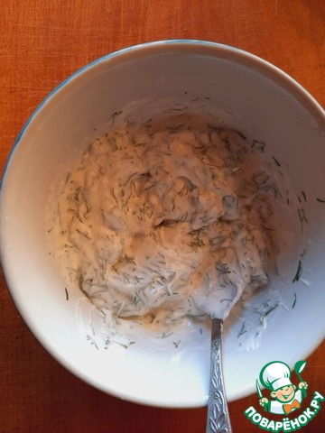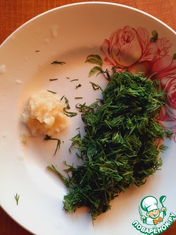 Смешайте соус: порубите зелень, пропустите чеснок через пресс или мелкую терку.
