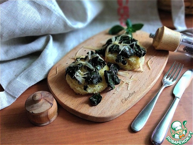 Подаём сразу, выложив горячую поленту на тарелку и сверху - обжаренный мангольд. Присыпаем Пармезаном.