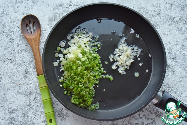 Сковороду разогреть, влить растительное масло. Выложить нарезанные лук и измельченный чеснок. Обжарить до прозрачности.