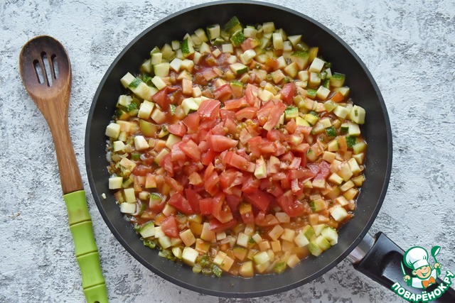 Нарезать кубиком томаты и добавить к овощам. Размешать томатную пасту в 0,5 стакане воды и влить в рагу из овощей. Посолить, поперчить, всыпать специи по вкусу (паприка, базилик, тимьян, орегано).
