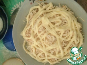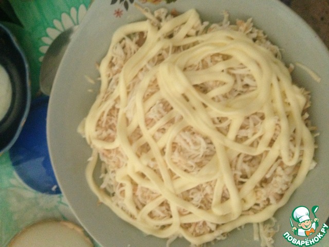 Сыр колбасный трем на мелкой терке. Смазываем майонезом