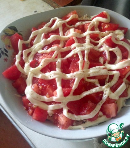 Помидор режем кубиками. Смазываем майонезом. Можно слегка поперчить. Вот и все. В принципе, по рецепту еще один слой - сухарики, но я никогда их не добавляю. Настаивать где-то полчаса. Приятного аппетита!