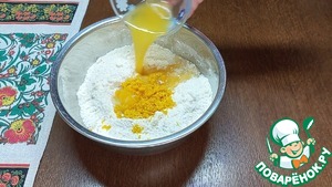 Предварительно я приготовила цедру с одного апельсина и с этого же апельсина у меня получилось 80 мл свежевыжатого сока. Добавляем в крошку одно среднее яйцо, цедру и апельсиновый сок.