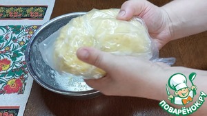 Замешиваем тесто. Оно должно получиться мягким и эластичным, даже слегка воздушным. Перекладываем его в пакет или оборачиваем пищевой плёнкой и отправляем в холодильник минут на 25-30.