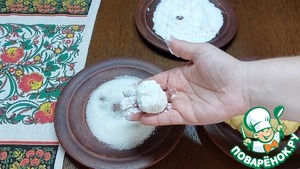 Достаем тесто из холодильника. Готовим для панировки сахар и сахарную пудру. Отщипываем от теста кусочек размером приблизительно с грецкий орех, выкладываем кусочек шоколада, хорошенько прищипываем, округляем и панируем сначала в сахаре, а затем в сахарной пудре. Благодаря этому они покроются в процессе приготовления приятной хрустящей корочкой.
