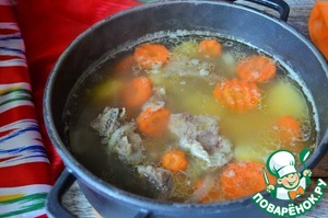 Мясо достать, бульон процедить. Налить бульон в чистый казан, добавить половину лука и кусочки моркови. Варить 10 минут.