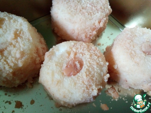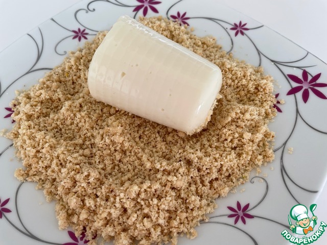 Измельчаем любые орехи. У меня молотый на мясорубке фундук. Выкладываем на плоскую тарелку. Достаем наши заготовки в стаканах. В руке переворачиваем стакан и указательным пальцем слегка надавливаем на содержимое стакана, пропуская по стенкам воздух. Пирожные таким образом очень легко выскользнут. Обваливаем в орехах бока.