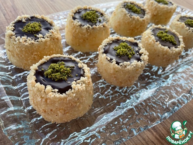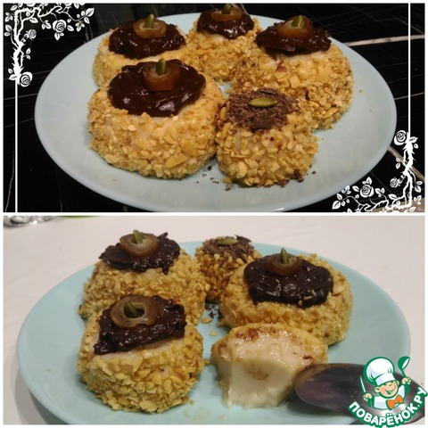 На сервировочное блюдо выставляем столбиками. Подогреваем в микроволновке или на водяной бане шоколад со сливочным маслом, тщательно перемешиваем. Чайной ложечкой поливаем вершинки наших пирожных и украшаем по собственному усмотрению.