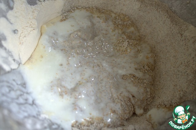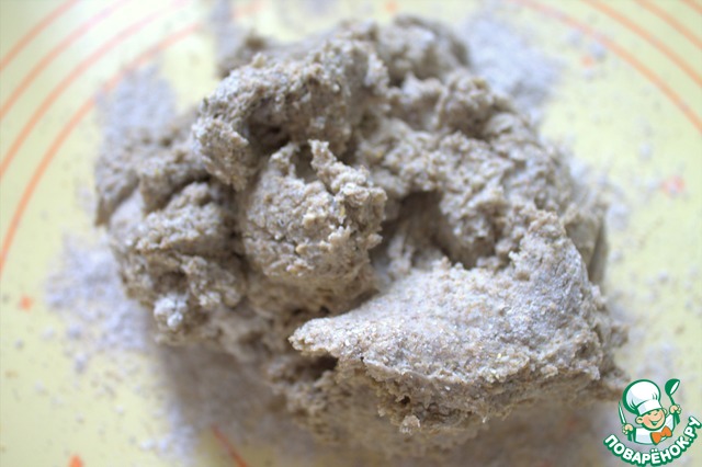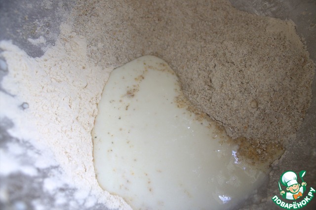 В чашу всыпать ржаную муку и горсть белой пшеничной. Раньше ржаная мука была грубая, белая мука добавлялась для эластичности.