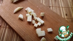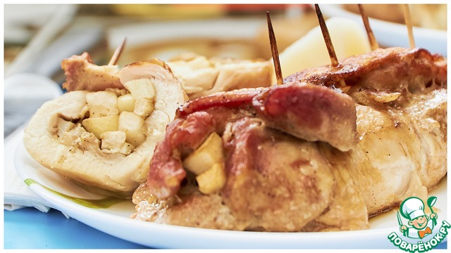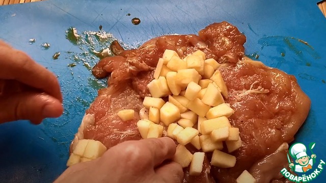 8) Берем куриное бедро, на него укладываем нарезанное кубиком яблоко и заворачиваем в рулетик, скрепляем зубочисткой.