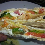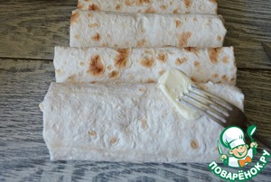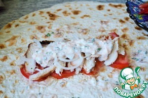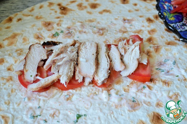 Лаваш нарезать квадратами, слегка смазать соусом (кисточкой). Выложить полоску помидоров, на них курицу.