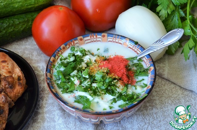 Приготовить соус, для этого смешать йогурт, кефир, рубленую петрушку с чесноком, ароматную соль и паприку. Именно, густой йогурт и кефир, не майонез, не сметану...