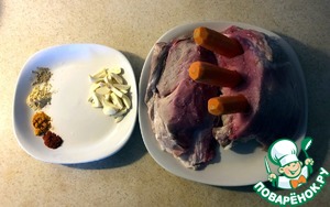 Горчицу, красный молотый перец, куркуму и четверть чайной ложки кардамона смешать. Чеснок покрошить вдоль на несколько кусочков. В моем случае использовано 2 формы с крышками (на 1,5 и 2 литра), поэтому мясо разрезала пополам (одна часть чуть большего размера). Маленьким узким ножом делаем достаточно глубокие надрезы в мясе и вставляем туда морковь. Отрезаем лишние половинки моркови и используем для другого куска мяса. Равномерно по всему куску мяса делаем небольшие разрезы и вставляем кусочки чеснока.