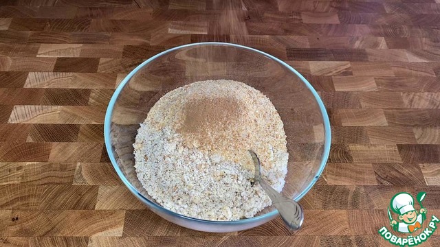 Смешать молотые орехи, панировочные сухари, сахар и корицу.