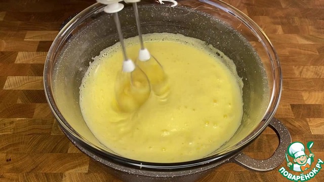 Для заливки: яйца и сахар взбить над паром, пока масса не нагреется. Затем снять ее с пара и продолжать взбивать до полного охлаждения.