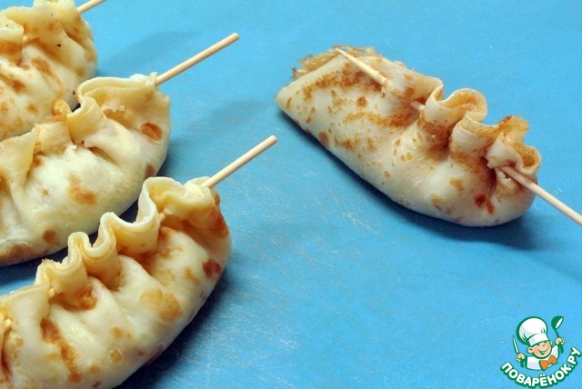 Выложить начинку в середину каждого блинчика. Проткнуть деревянными шпажками.