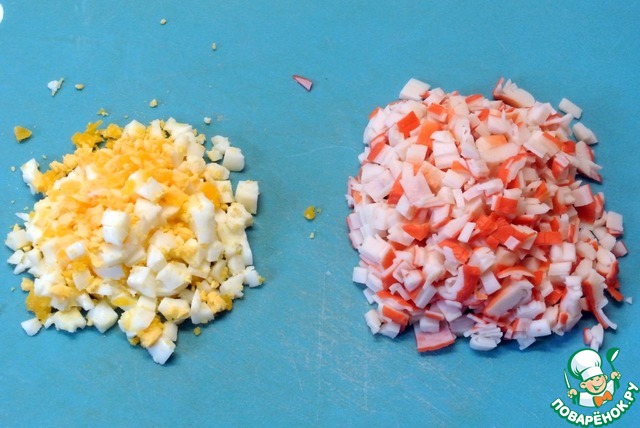 Отварить яйца, очистить, отварить. Мелко нарезать. Крабовые палочки нарезать кубиками.