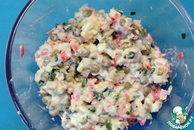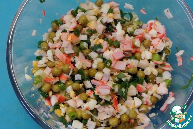 Продукты выложить в салатник. Добавить зеленый горошек.