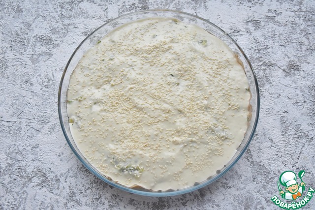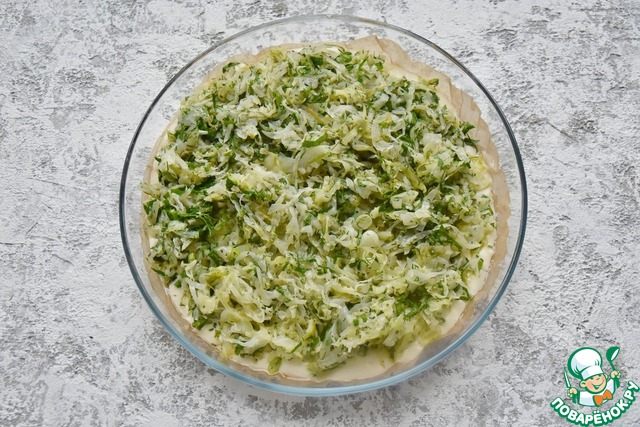 Для надежности выстелить дно формы пергаментной бумагой и смазать растительным маслом. Выложить часть теста, сверху распределить капустную начинку.