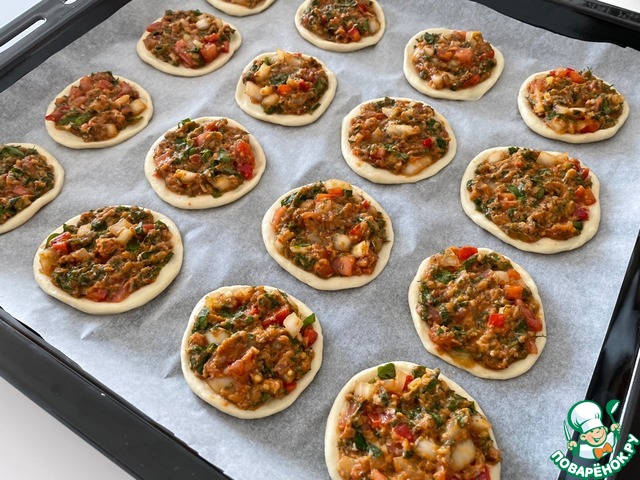 На русский язык переводится как «Лахмаджун - фундук» и является миниатюрным закусочным блюдом «на один зубок», родиной которого принято считать город Тарсус на юго-востоке Турции. Крошечные лепешки из теста, покрытые смесью фарша и овощей, подаются в ресторанах при ожидании смены блюд. Мы попробуем взглянуть на это блюдо с повседневной точки зрения и приготовим аппетитные мини – лахмаджуны на обычной кухне, тем более все необходимые продукты у нас под рукой.