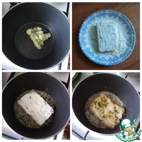 Замороженное ароматизированное масло-соус выкладывают в сковороду. Растапливают его и выкладывают обваленную в муке рыбу. Нужно чтобы соуса было примерно 2 см на дне сковороды и рыбу обжаривают как во фритюре. Это быстро по паре минут с каждой стороны. Соусу дают слегка подгореть.