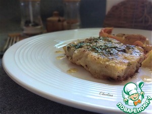 Подаём. Выкладываем рыбу на тарелку. Гарнир у меня будет запечённый картофель дольками с болгарским перцем. Поливаем его оставшимся соусом со сковороды из-под рыбы.