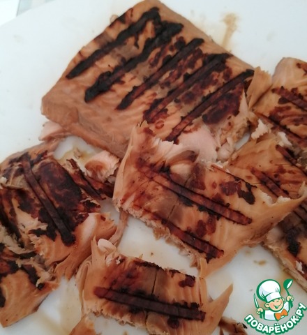 В смеси соевого соуса, лимонного сока и мёда замариновать лосось, присаливаем если надо.