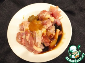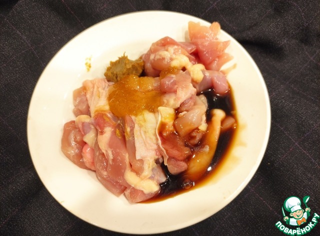 Куринные бедра очищаем от костей и кожи, нарезаем небольшими пластами и добавляем горчицу, мед и соевый соус, и отправляем мариноваться от 1 часа до 12 часов в холодильнике.