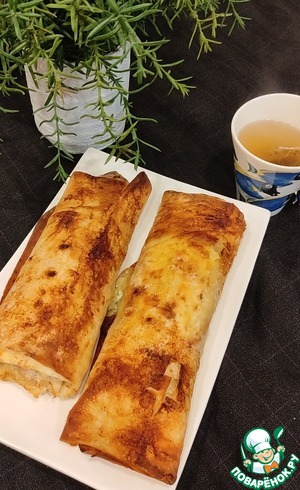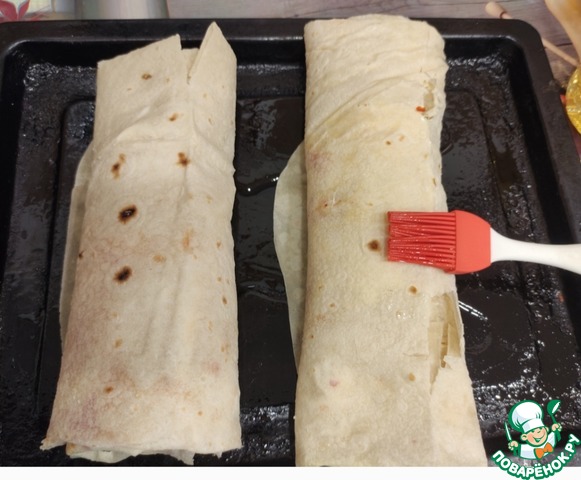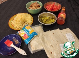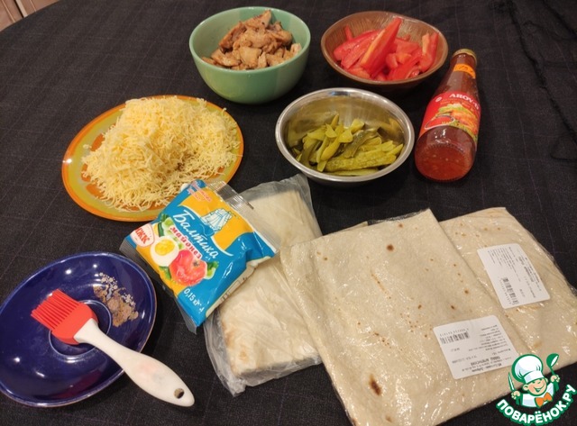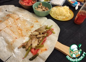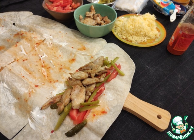 А тут курицу разобрать, "замариновать на 1-12 часов", огурцы-помидоры соломкой, сыр на терке, соус-майонез, собрать-намазать-завернуть и запечь в духовке, всего-то! )