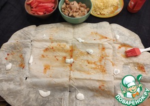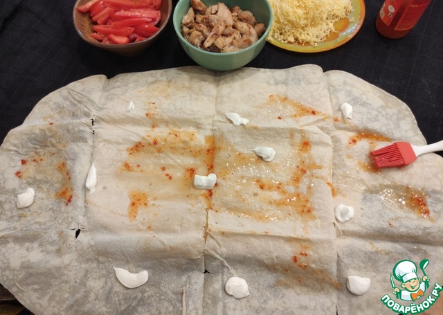 Собираем чизурму, намазываем слой соуса, майонеза на лаваш