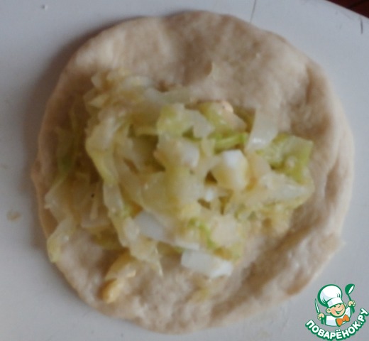 Формуем пирожки: Поднявшееся тесто обминаем и делим на небольшие кусочки. Из кусочка делаем лепешку и кладем туда чуть меньше ст. л. начинки.