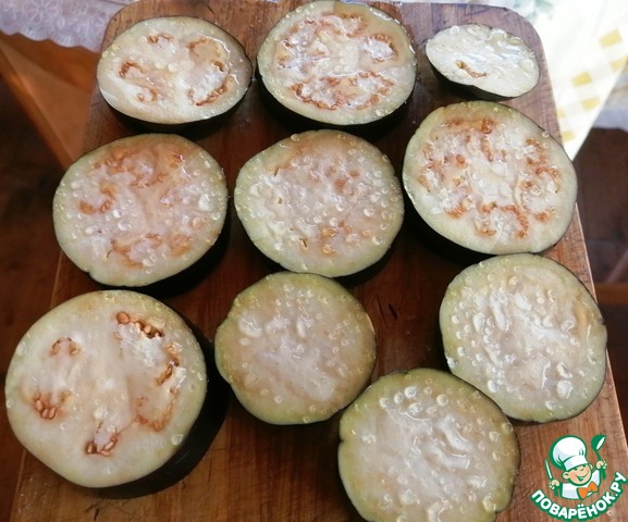 Баклажаны порезать кружочками, посолить, оставить на 15 минут, после чего промакнуть салфеткой. Многие считают, что данный шаг не нужен. Конечно же, он необязателен. Но есть мнение, что даже если в баклажанах нет горечи, соль "уплотняет" мякоть баклажан, поэтому при жарке они впитают меньше масла. Выбор за вами :)